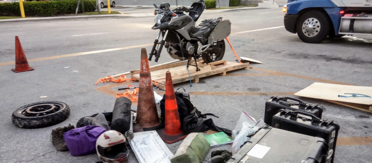 A number of Spanish-speaking workers gathered around to see this strange piece of cargo. I had fun telling about my trip to this wide eyed audience. A few of them helped me lift Annie onto her center stand. From there, I could do the rest by myself.